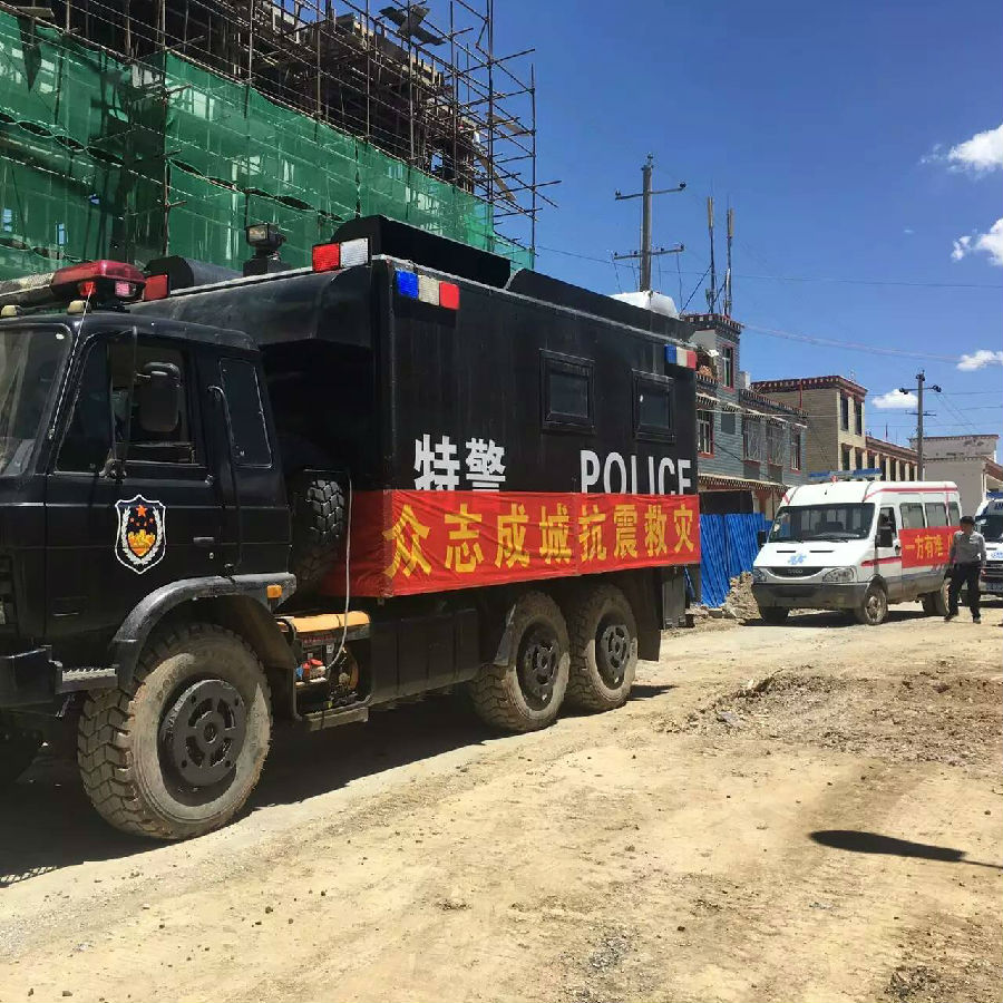 丁青縣公安局接到命令火速趕往救災現(xiàn)場,保障人民群眾的生命財產安全,所屬的東風六驅炊事車緊急跟隨,第一時間提供飲食保障。