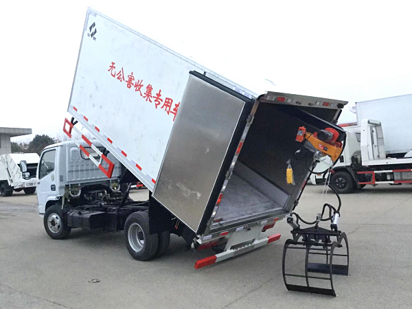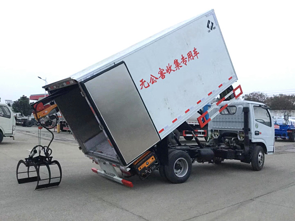 東風多利卡智能無線遙控無公害處理車(銷售15271321777)箱體裝有收集設備(分牽引型、起吊型),制冷系統,噴霧消毒、紫外線殺毒燈,箱體帶自卸功能,廢液收集槽收集箱,3kw汽油發動機。采用國內最主流生產工藝制作,廂體外玻璃鋼,內不銹鋼制作,中間為8CM聚氨酯保溫板,廂板一次成型,具有優良的保溫性、穩定性、氣密性并且使用壽命長。