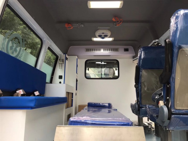 福特全順V348運送型醫療救護車隨原車選裝車頂四周單個或多個爆閃燈,選裝換氣扇、牌照板、側踏板; ABS型號:6C11 2M110 A*,生產廠家:博世汽車部件(蘇州)有限公司; 車內裝置藥品柜、擔架、氧氣瓶等專用裝置,用于救護或運送傷病人員