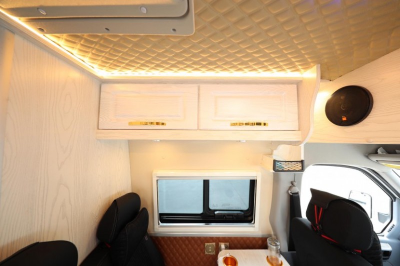 進(jìn)入到車內(nèi),整個(gè)內(nèi)飾采用大量的原木家具和中式花紋裝飾,主副駕座椅也都是可旋轉(zhuǎn)的。駕駛室上方是一個(gè)大的儲(chǔ)物艙,雜物行李都可以放在這里。儲(chǔ)物艙下方還配有一臺(tái)19寸吸頂電視,主副駕座椅旋轉(zhuǎn)過(guò)來(lái),即可與第二排座椅形成一個(gè)多人客廳,這樣家人們就可以圍在一起吃飯。要休息時(shí),降下桌板,放倒座椅,一張兒童床就出來(lái)了。上方的兩個(gè)木紋吊柜也能存放一些行李。