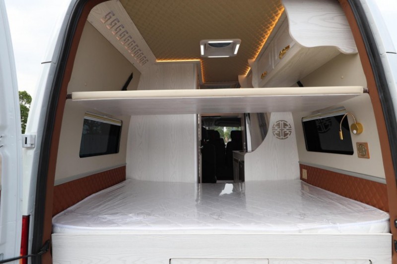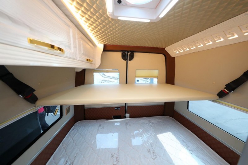 車廂尾部是橫置的上下床,下床尺寸為1800*1200(mm)的雙人床,上方還有一張尺寸為1700*700(mm)的吊床,可以睡一個(gè)成年人或小孩,不用時(shí)可拆下靠于后門上,車頂左側(cè)的兩個(gè)儲(chǔ)物吊柜可以用來(lái)存放衣物,中間帶環(huán)形LED燈的換氣扇也十分實(shí)用。