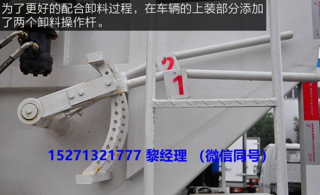 CLW5110ZSLD4型散裝飼料運輸車為了更好的配合卸料過程,在車輛的上裝部分添加了兩個卸料操作桿。其選用與箱體同樣的材料制作而成,所以手感也足夠結實可靠,操作起來也簡單